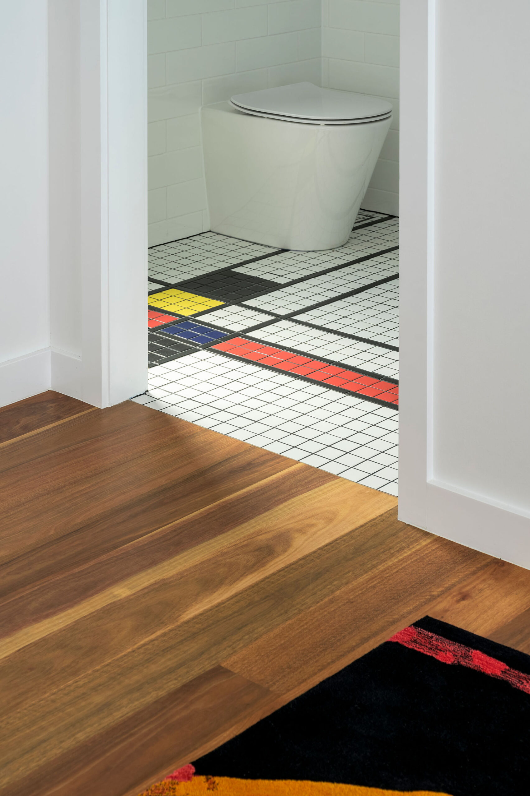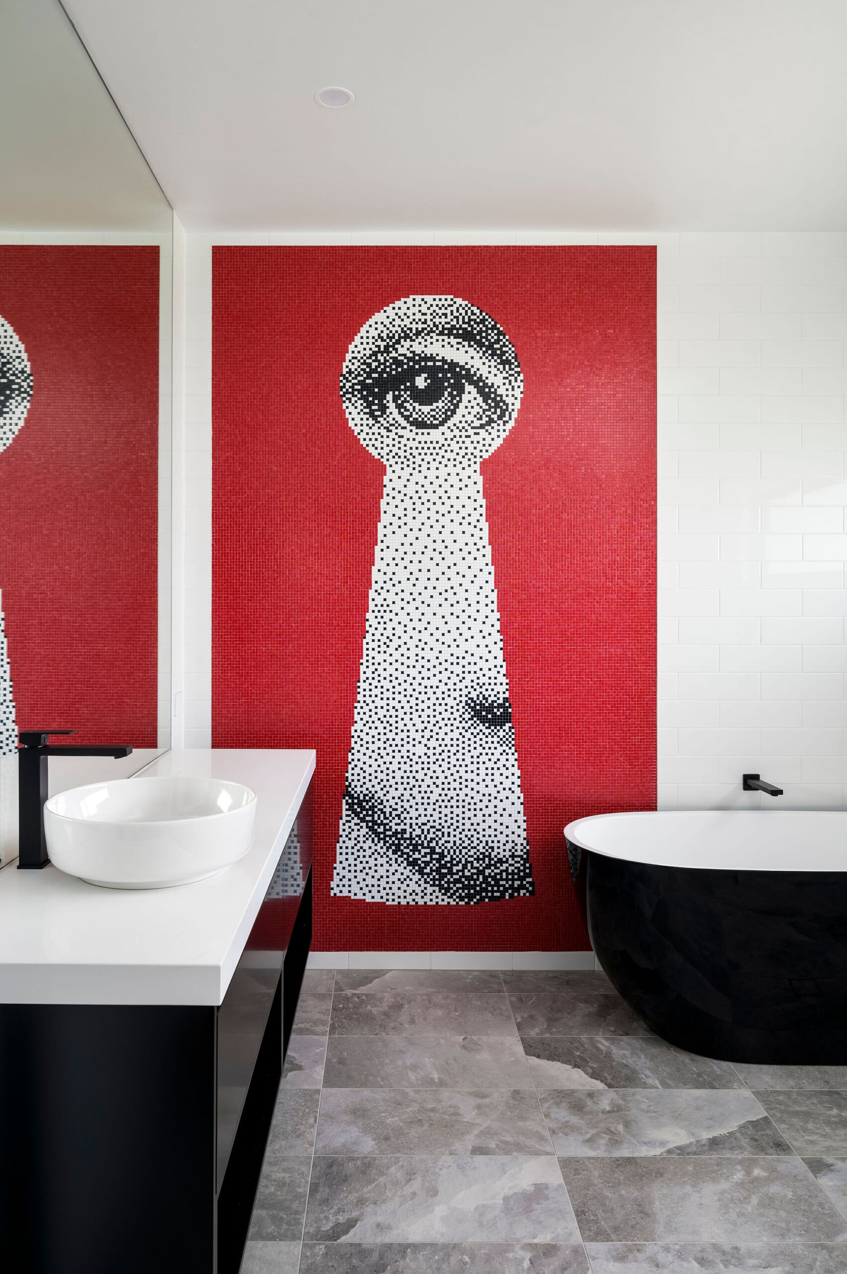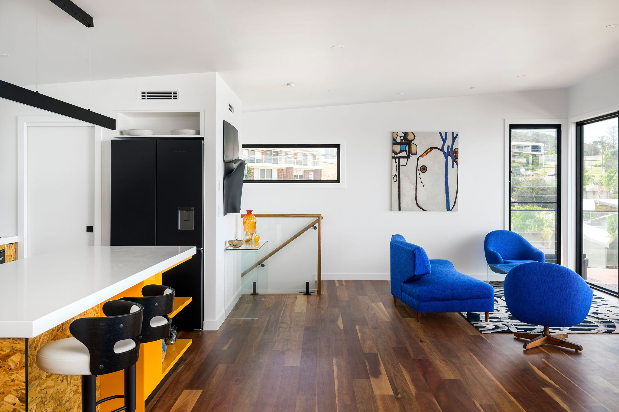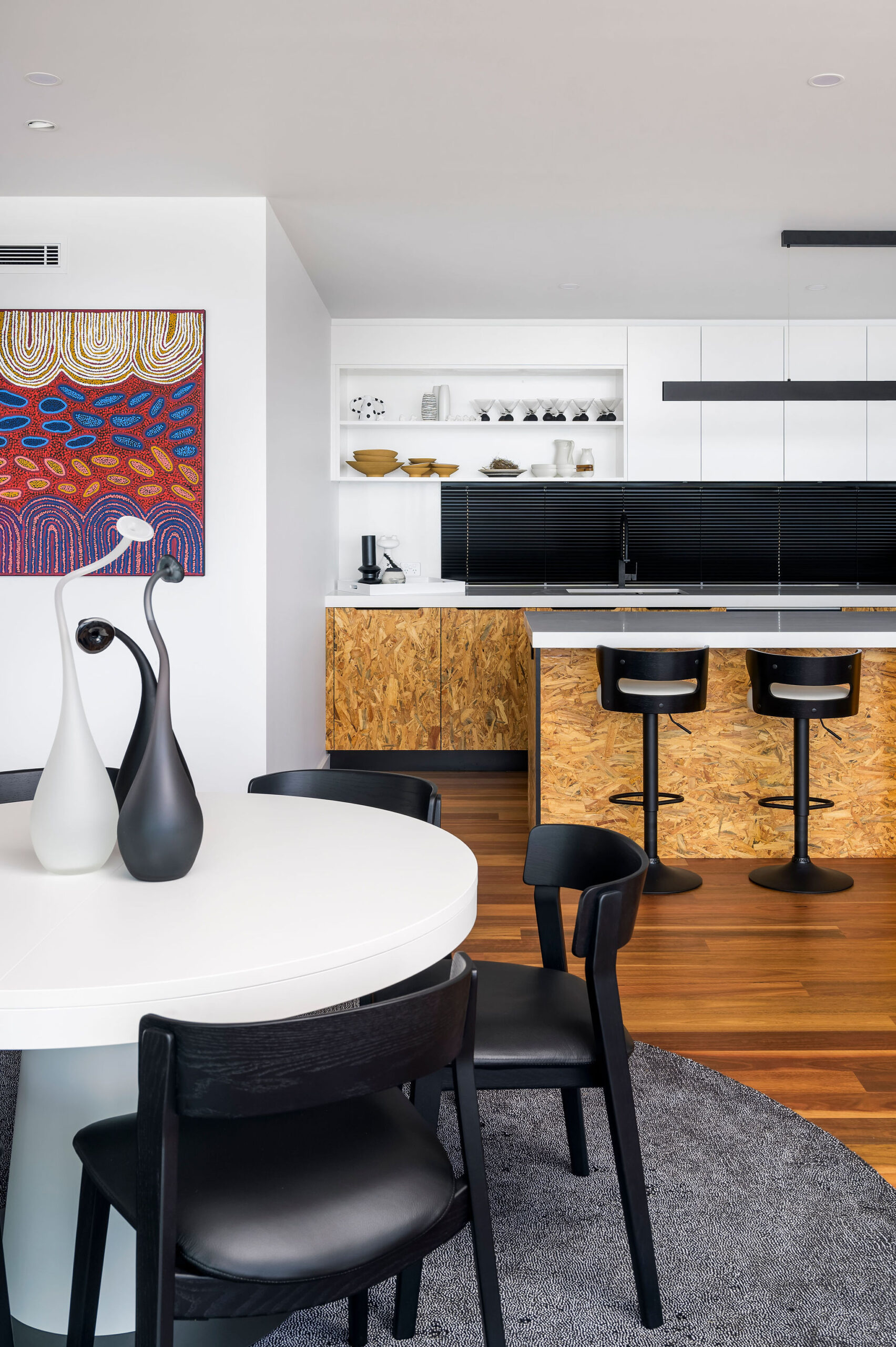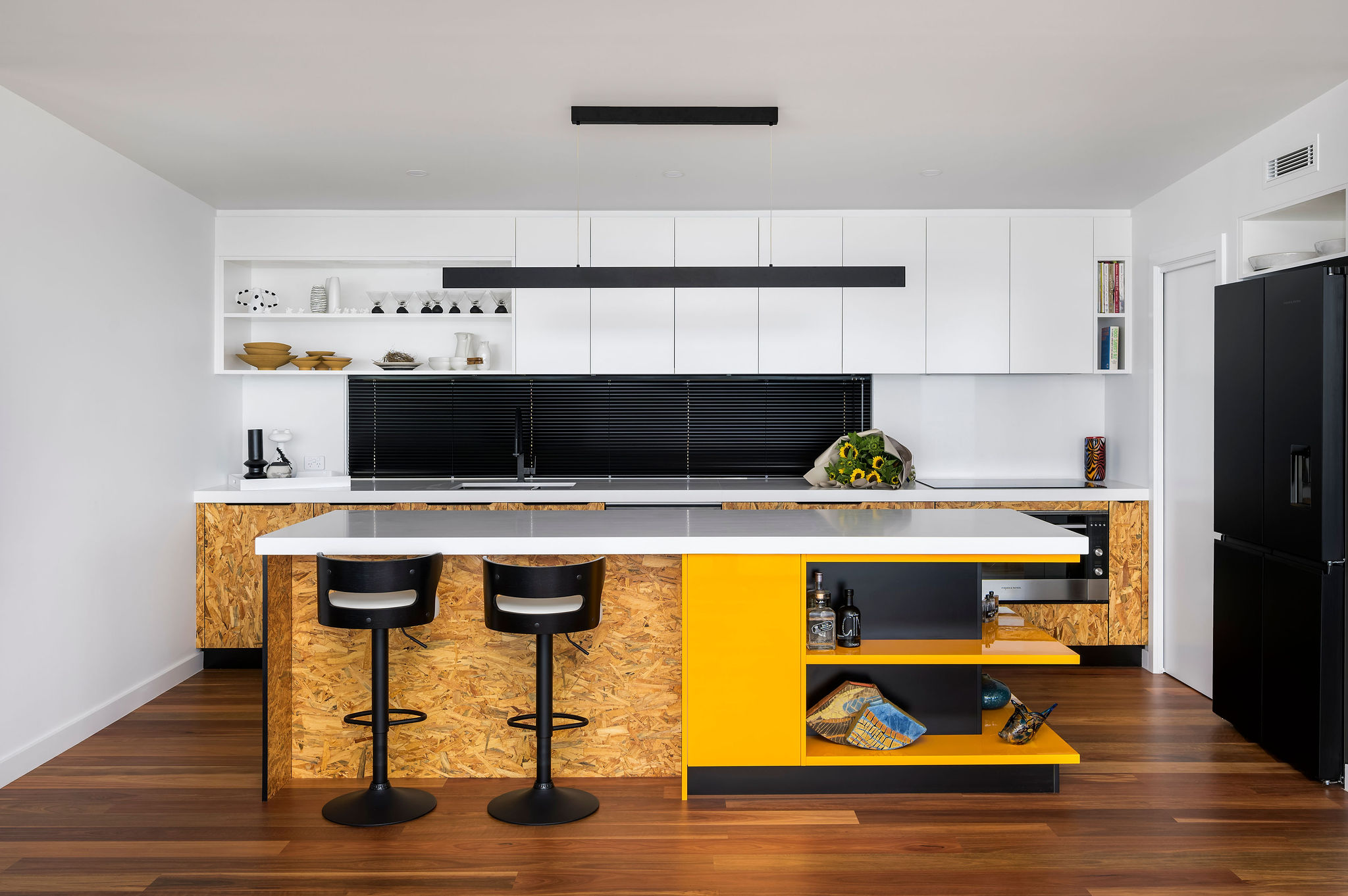 Internally, a consistent palette of black, white and grey provides a blank canvas for pops of colour and warmth in the form of a large Fornasetti mosaic tiled Bathroom wall, OSB and yellow Kitchen elements, a Mondrian inspired Powder Room tiled floor, spotted gum flooring, as well as the extensive art collection now on display giving this house its name.