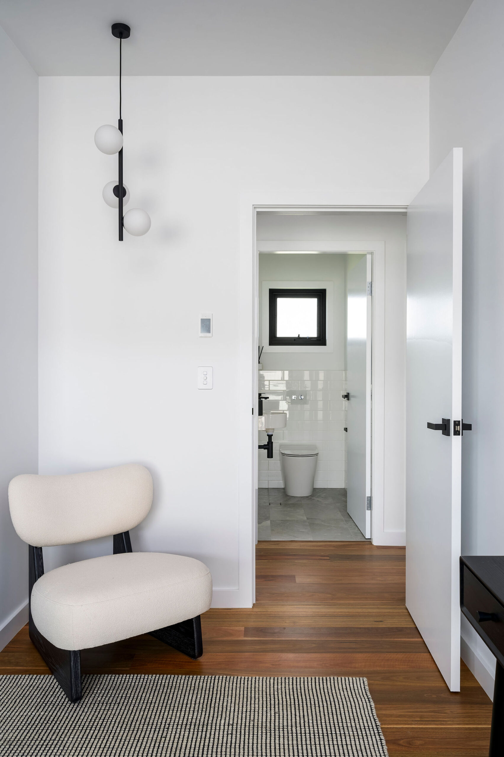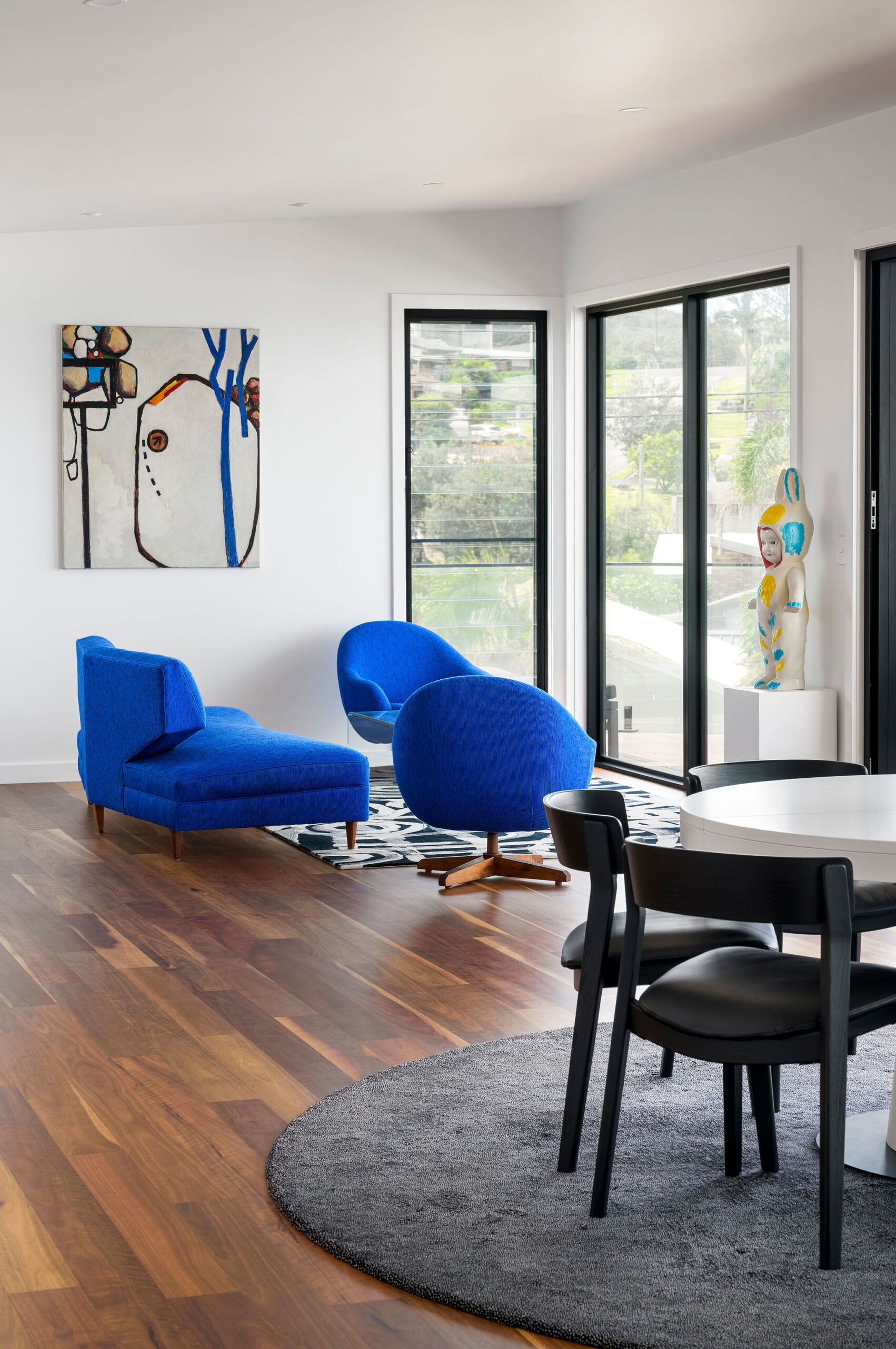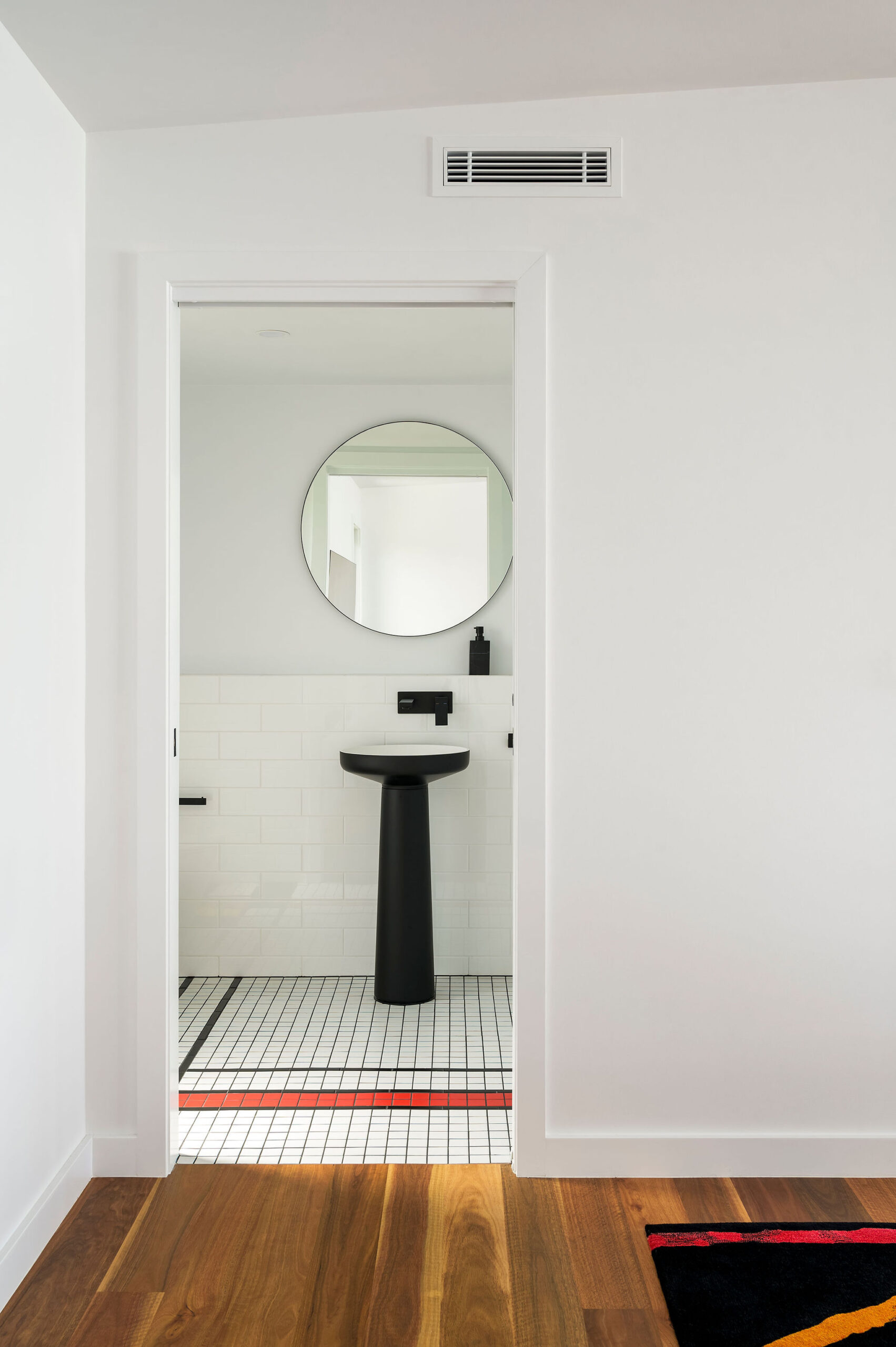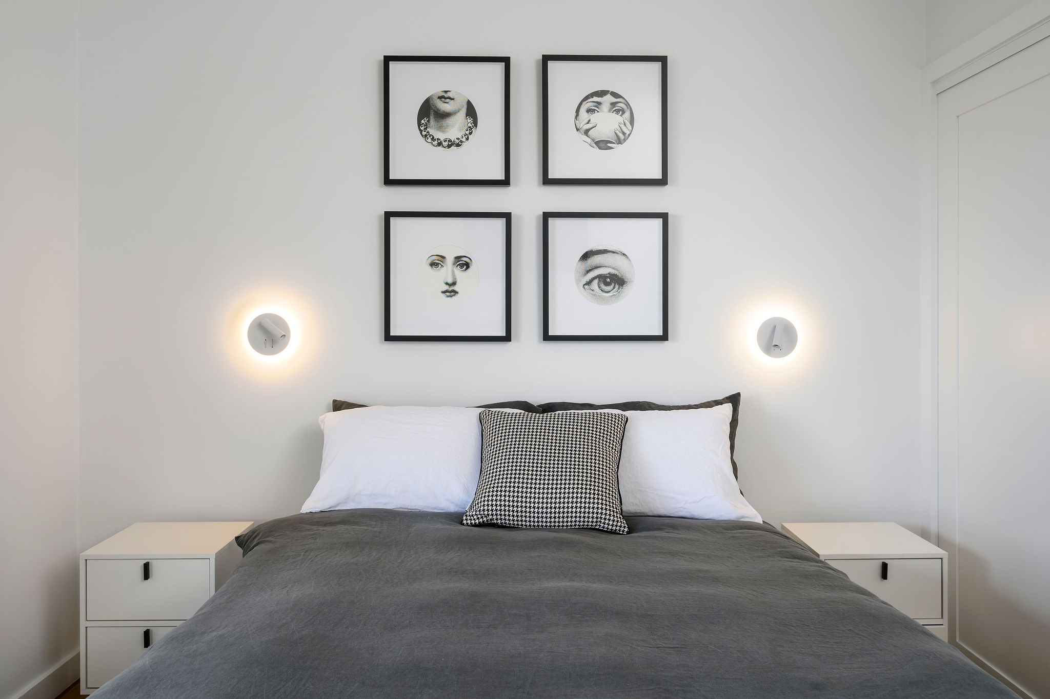 Internally, a consistent palette of black, white and grey provides a blank canvas for pops of colour and warmth in the form of a large Fornasetti mosaic tiled Bathroom wall, OSB and yellow Kitchen elements, a Mondrian inspired Powder Room tiled floor, spotted gum flooring, as well as the extensive art collection now on display giving this house its name.