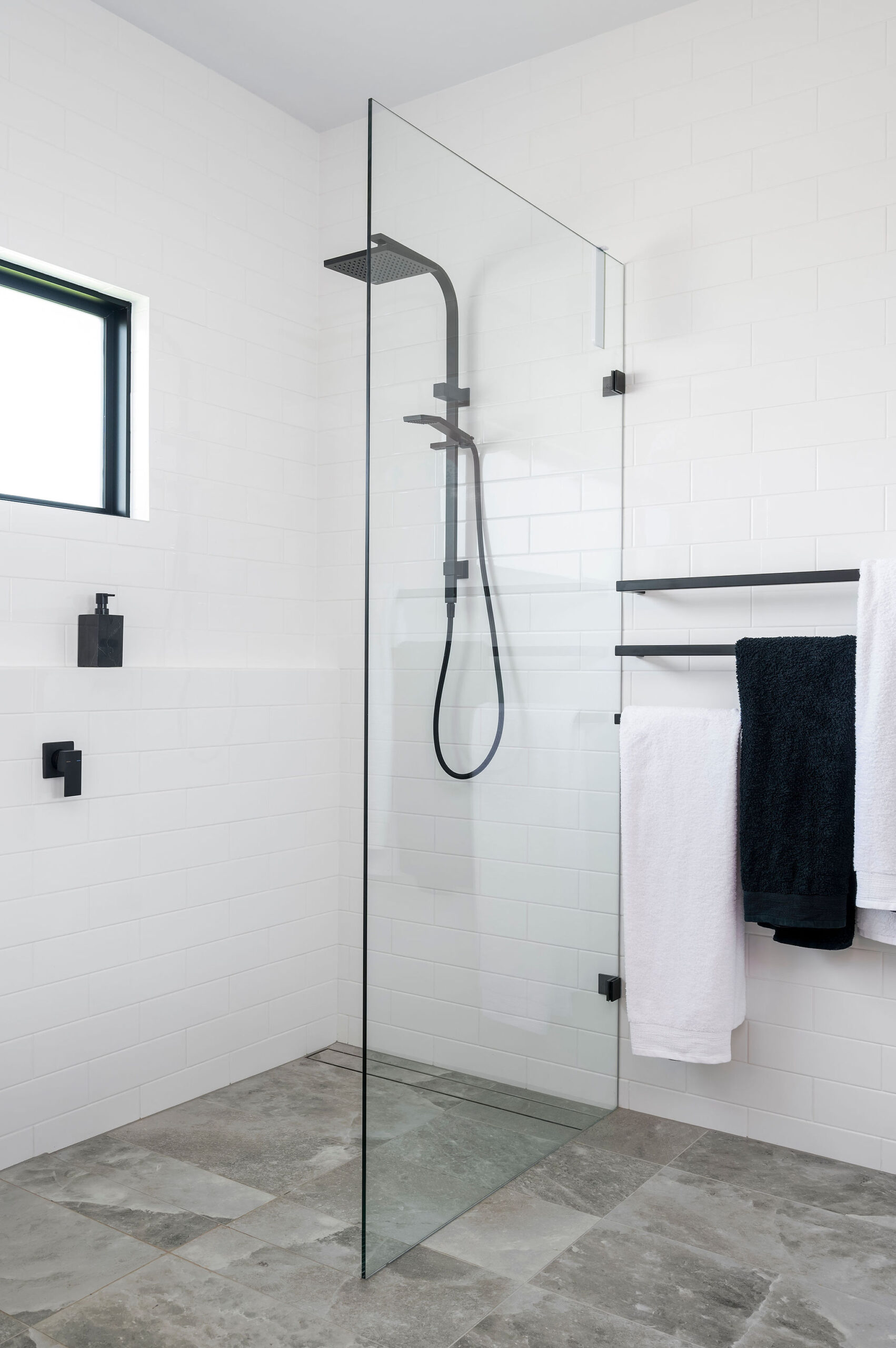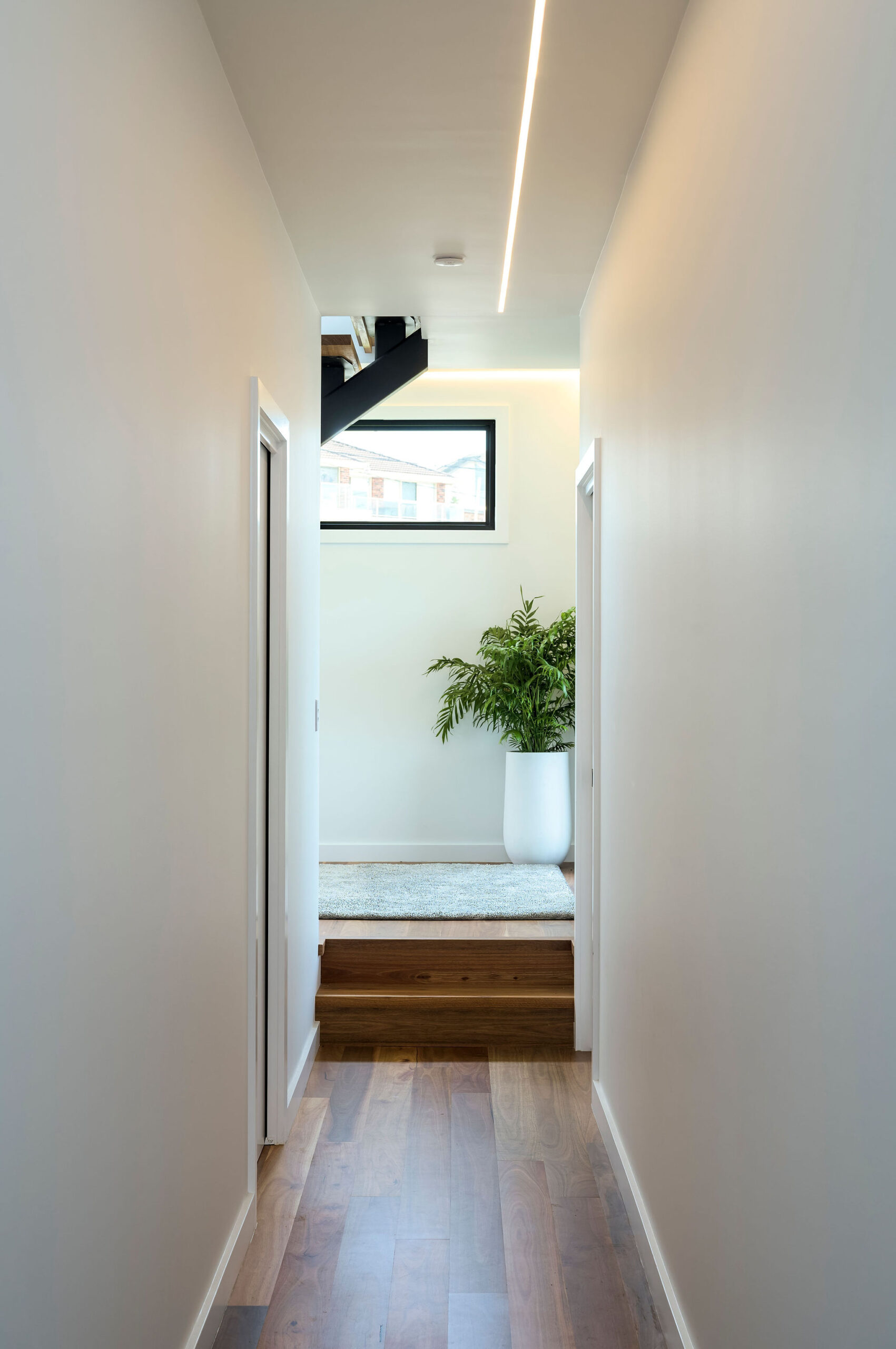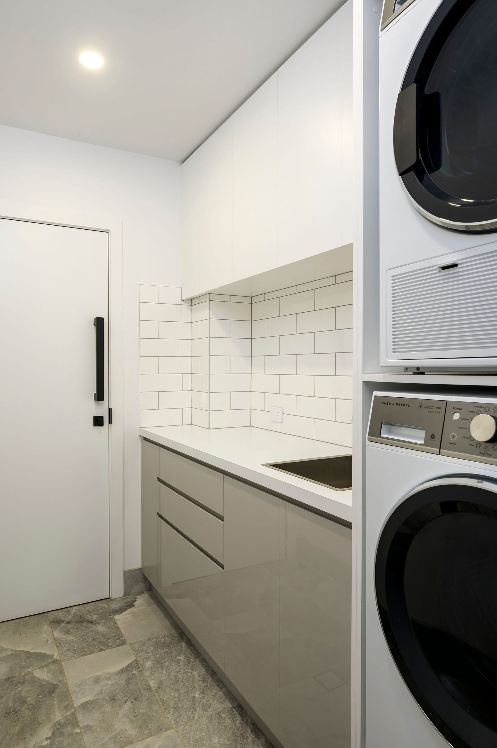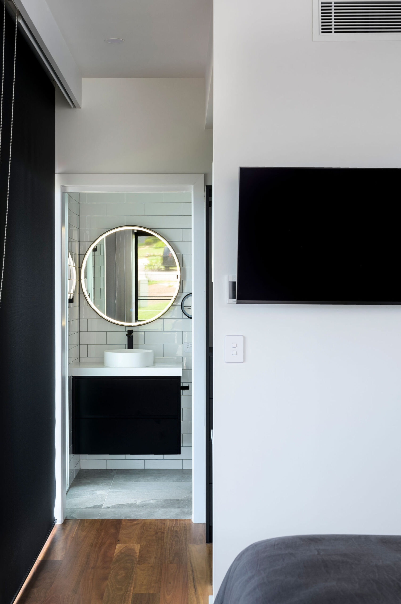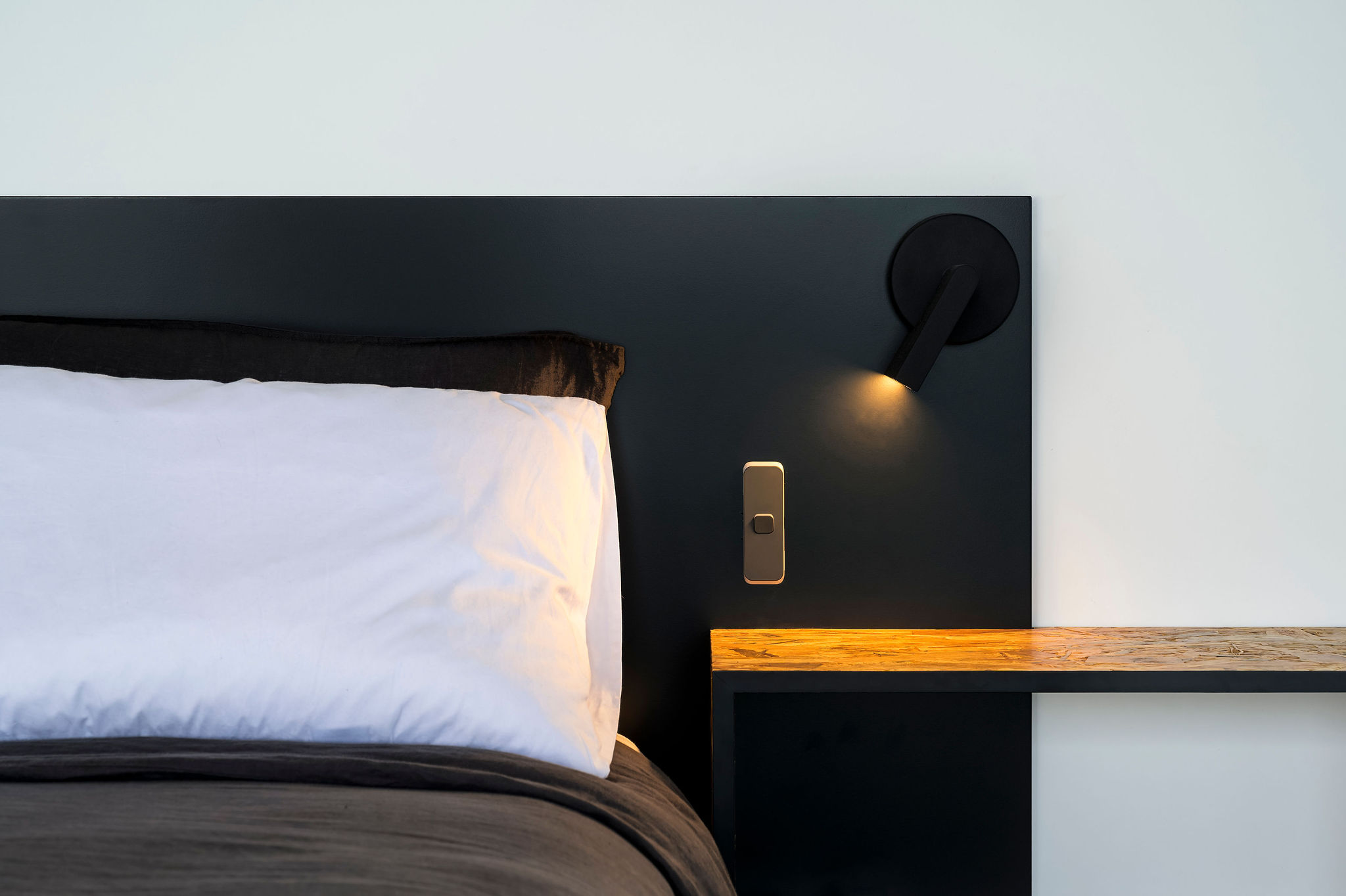 Internally, a consistent palette of black, white and grey provides a blank canvas for pops of colour and warmth in the form of a large Fornasetti mosaic tiled Bathroom wall, OSB and yellow Kitchen elements, a Mondrian inspired Powder Room tiled floor, spotted gum flooring, as well as the extensive art collection now on display giving this house its name.