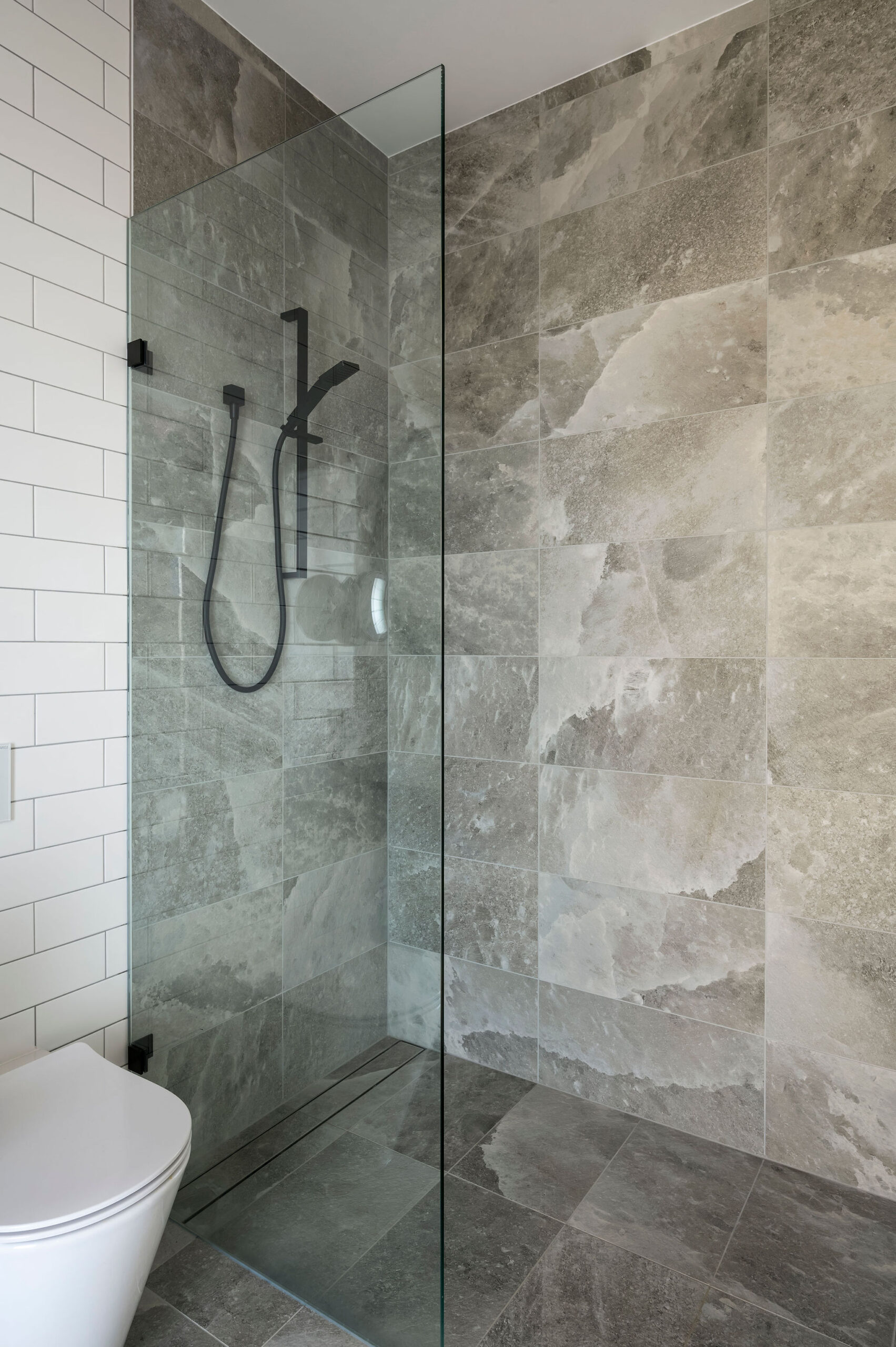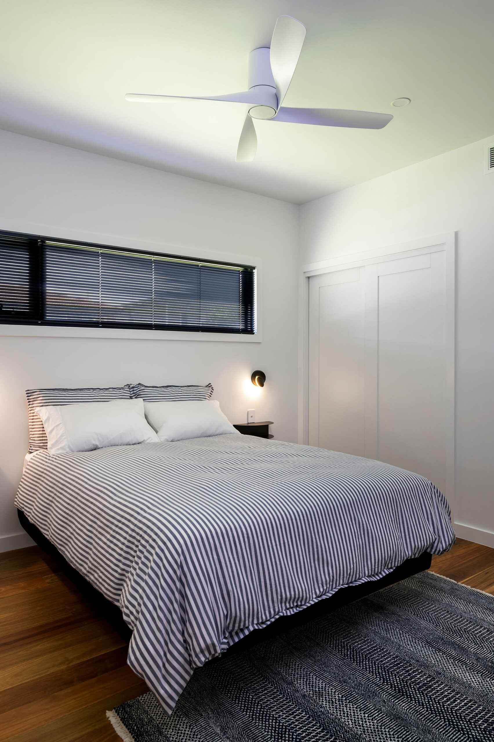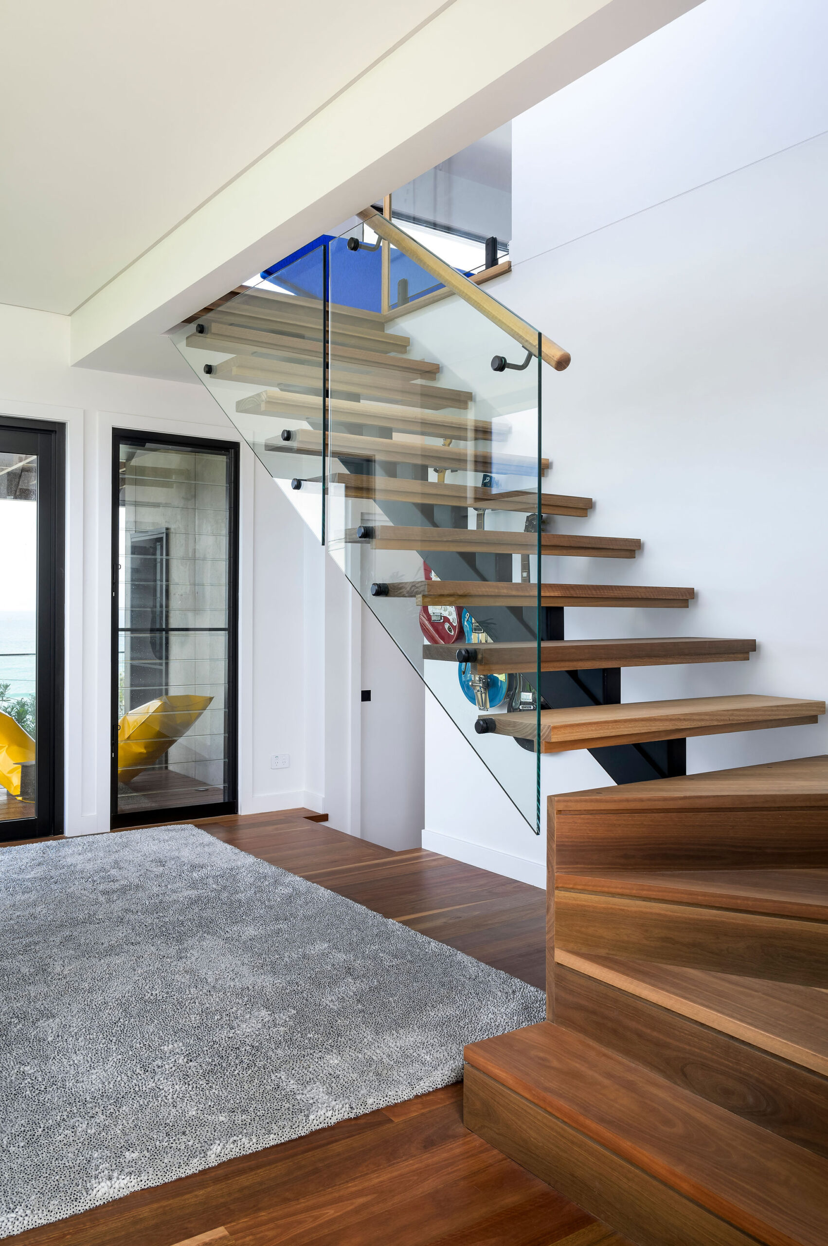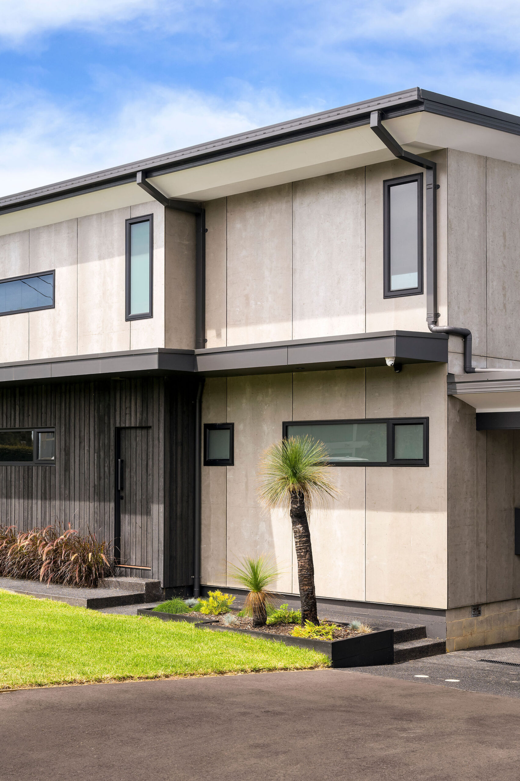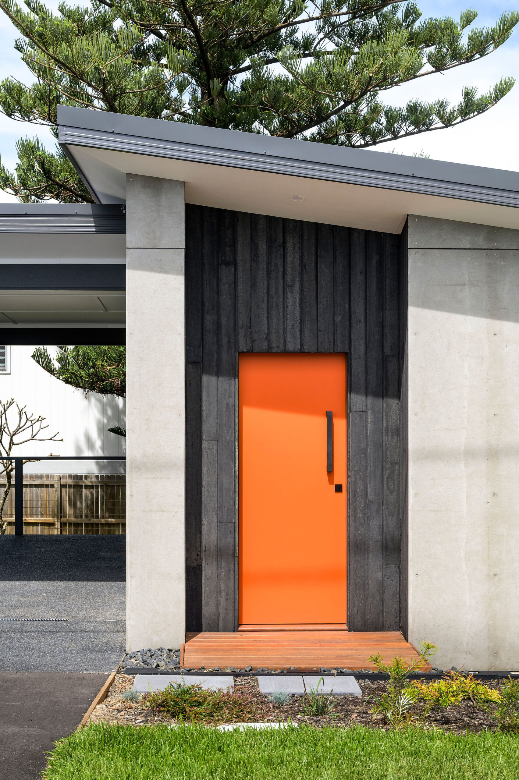 Externally, large spans of steel support the roof and allow for an almost unobstructed view. Low maintenance and unique exterior cladding materials, including Shou Sugi Ban (Japanese charred timber) and Viroc panels create a minimalist and texturally rich aesthetic. A custom graffiti front door completes the look.