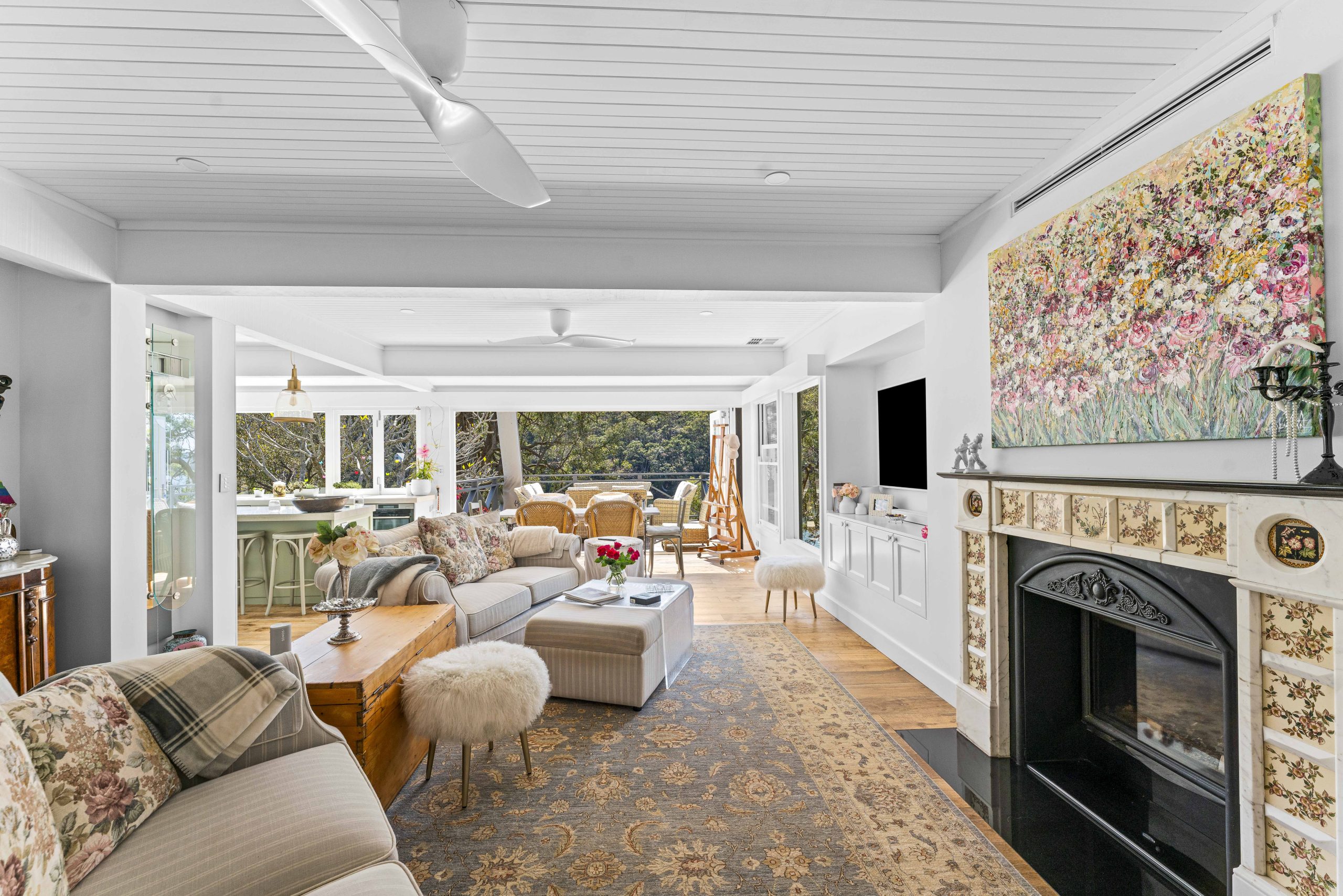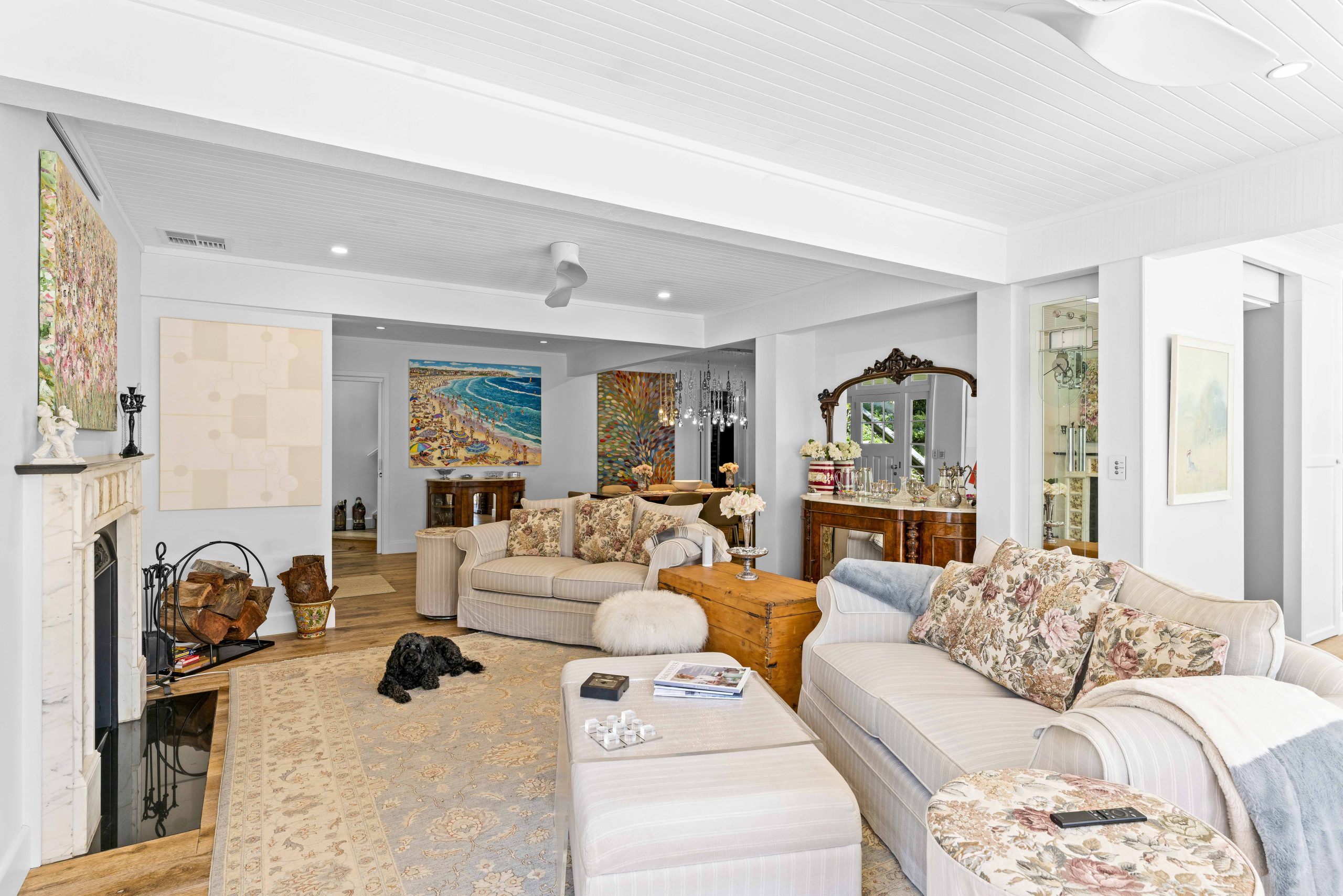 The original cottage, with its roots dating back to the early 1920s, has undergone a meticulous renovation that showcases high-end detailing throughout. V-joint ceiling linings and custom joinery add a touch of sophistication, while the 1800s fire surround and feature mirror wall pay homage to the home’s historical origins.