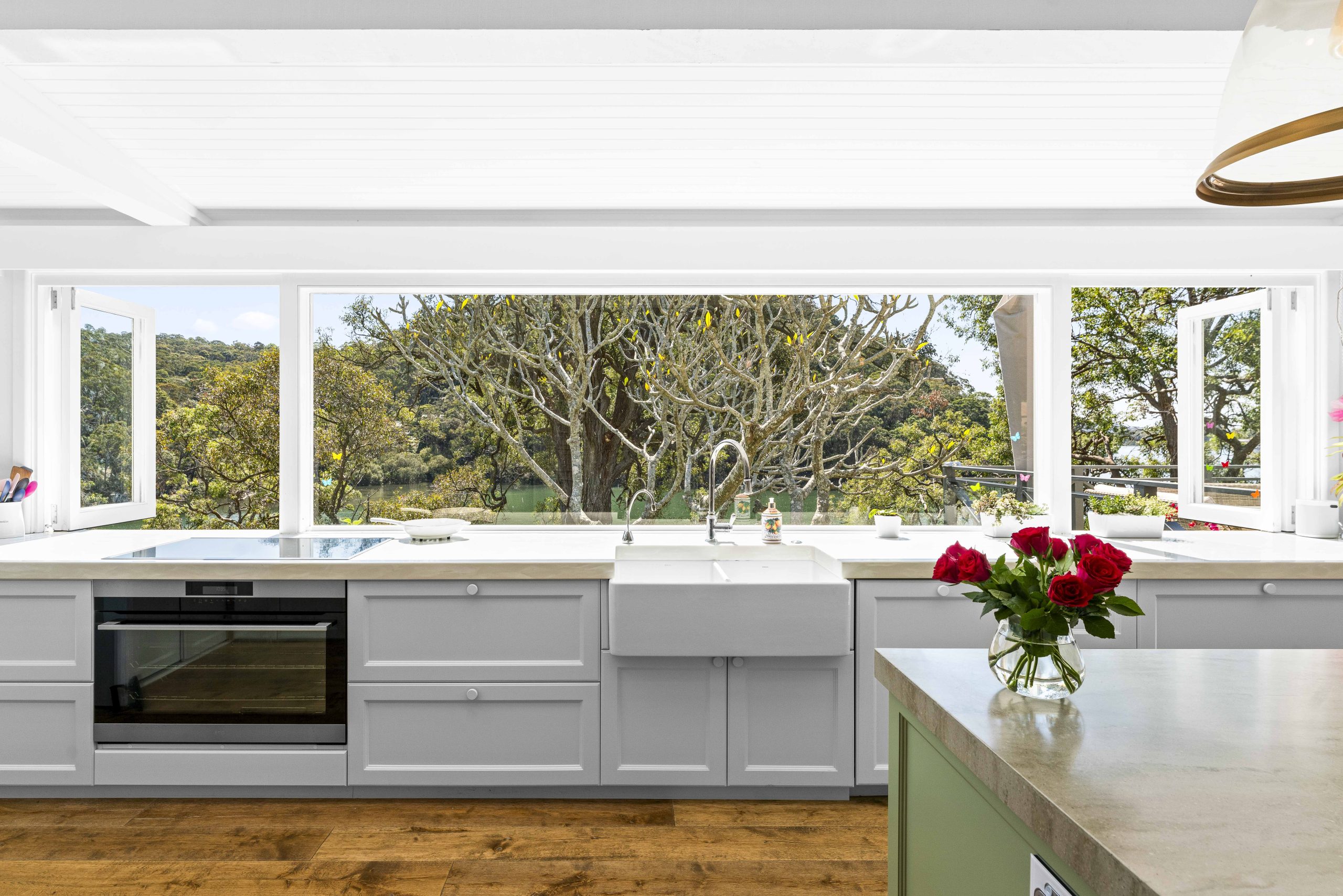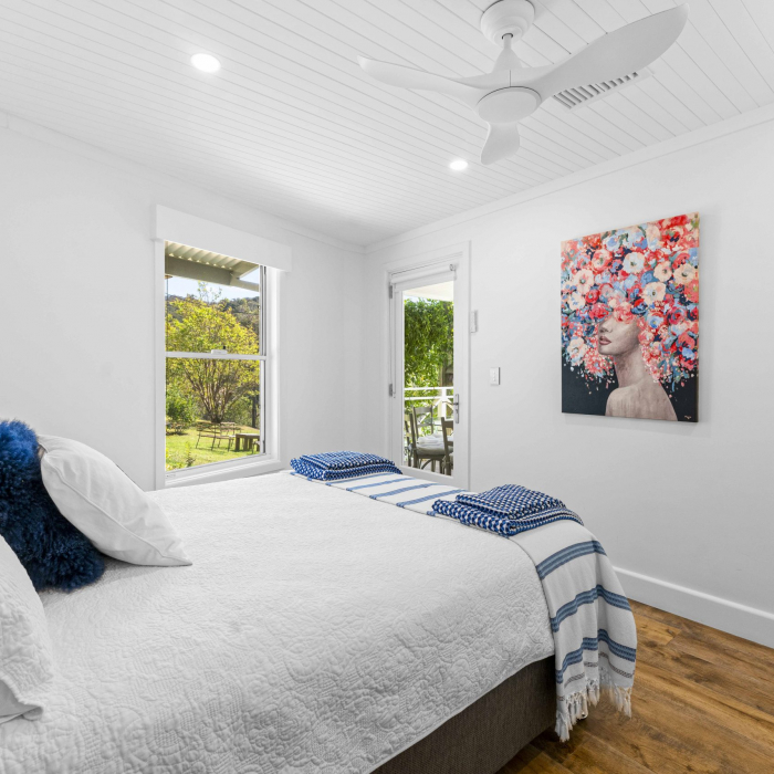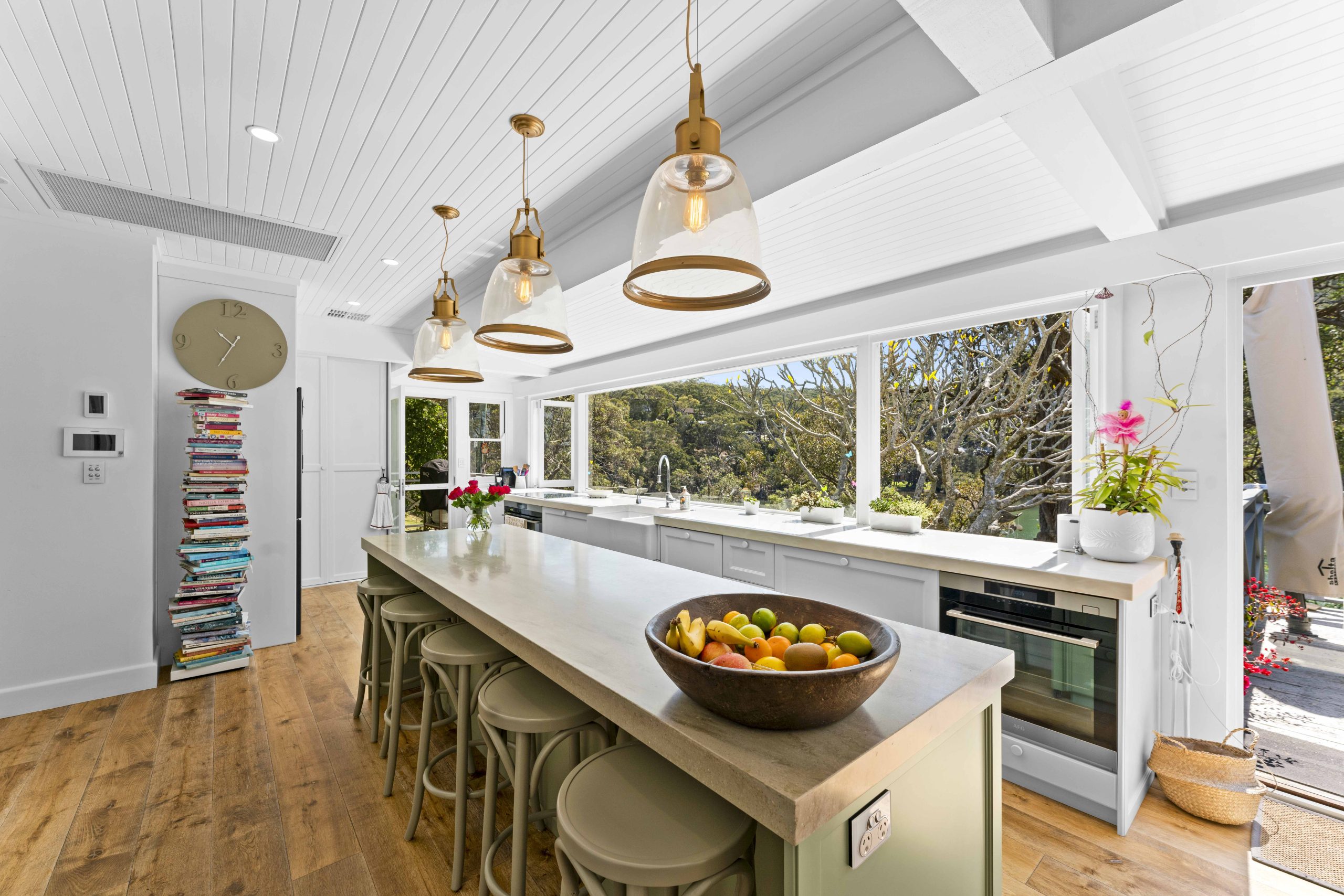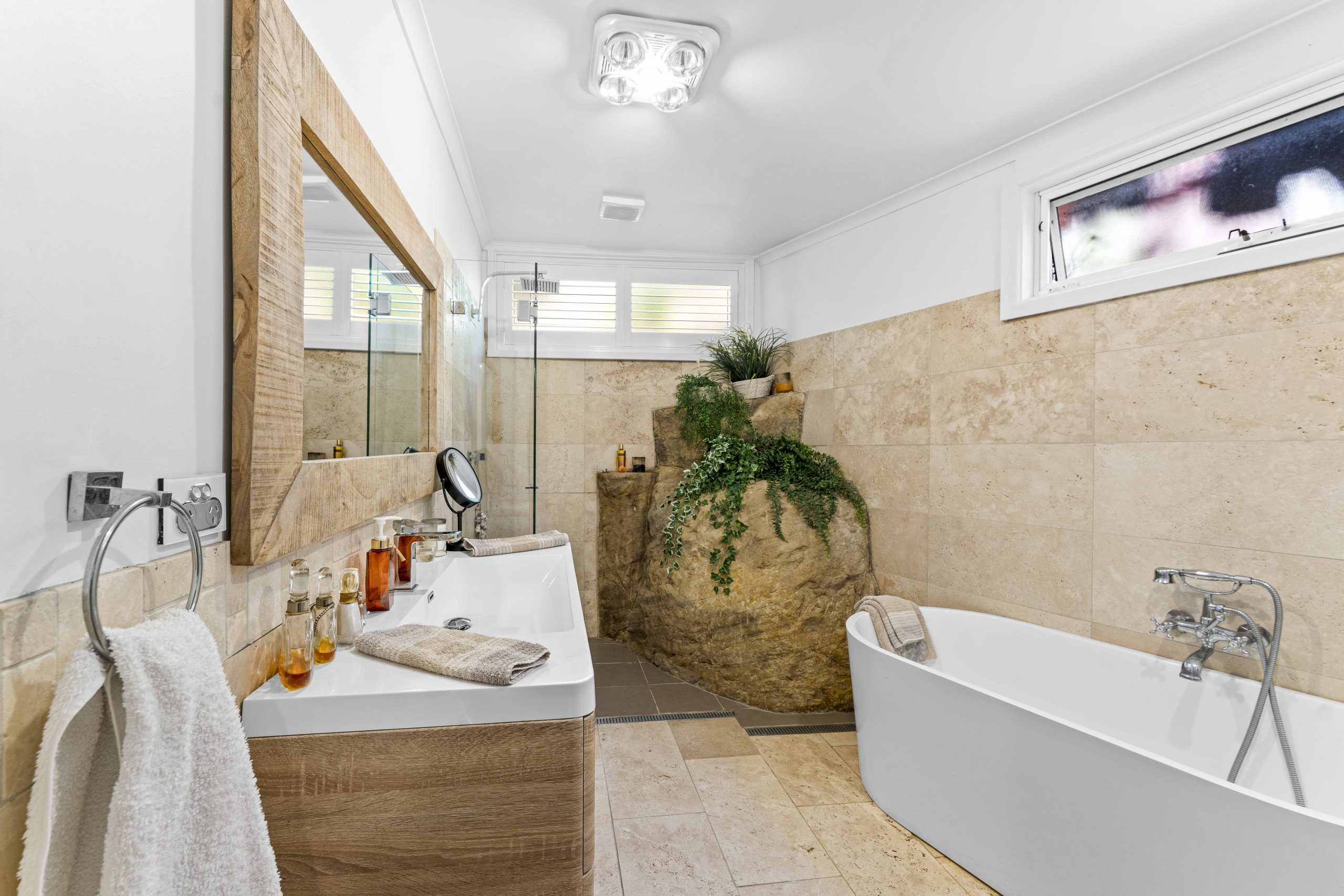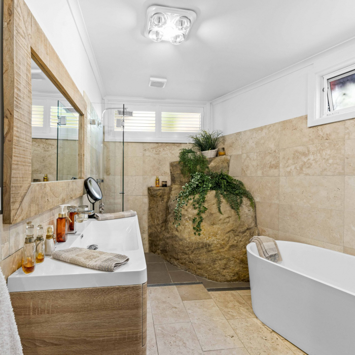 Rustic Touch’s expertise in alterations and additions is evident in the structural components seamlessly integrated into the home. The bathroom, adorned with an exposed rock wall, serves as a testament to the marriage of natural elements and contemporary design. While the heart of this residence is its open-planned kitchen, where the seamless 6m window frames a captivating panorama of Brisbane Water and the surrounding bushland.