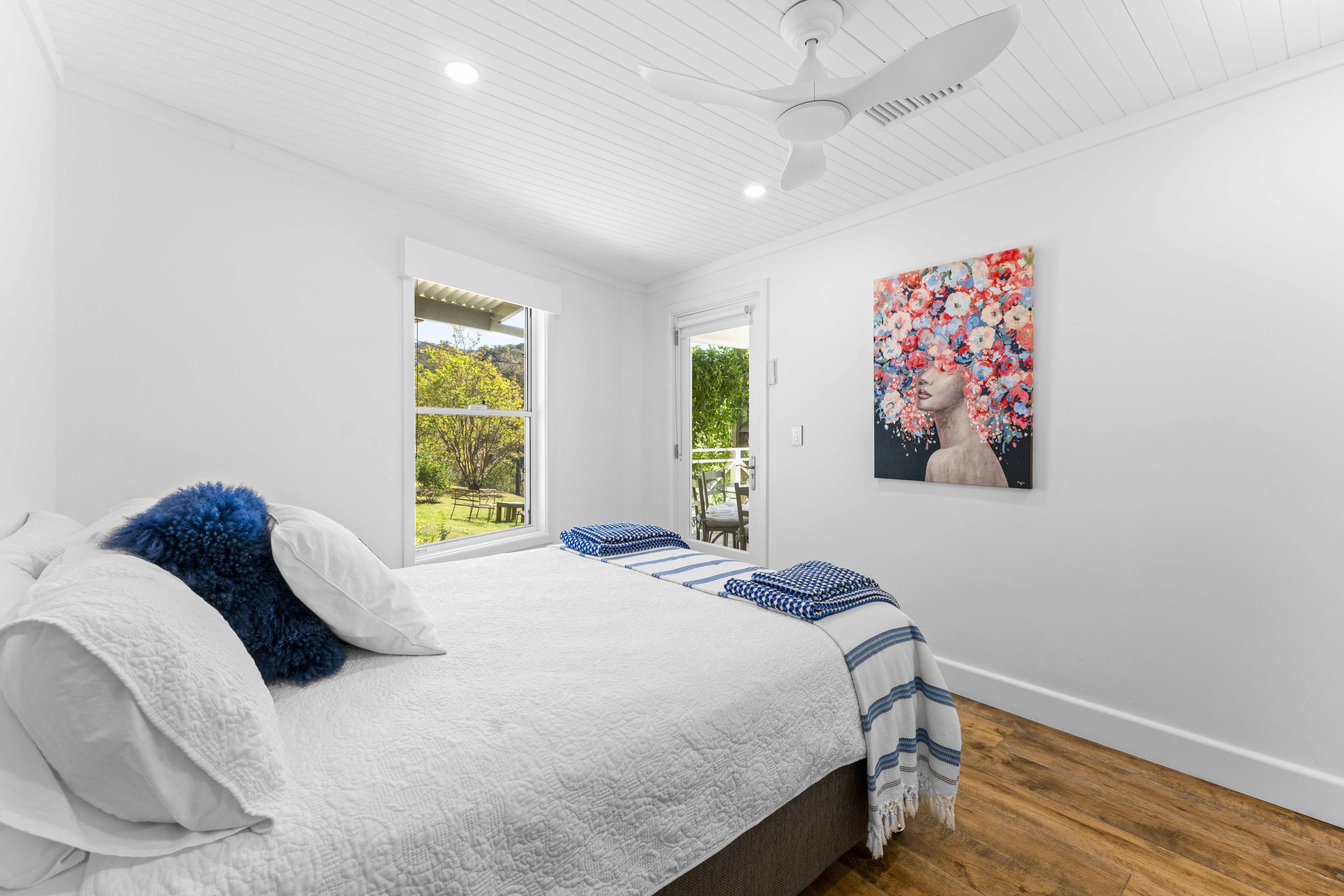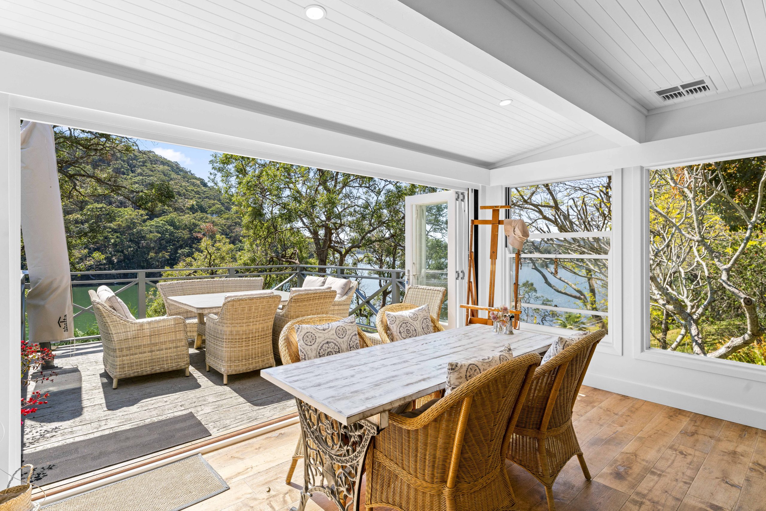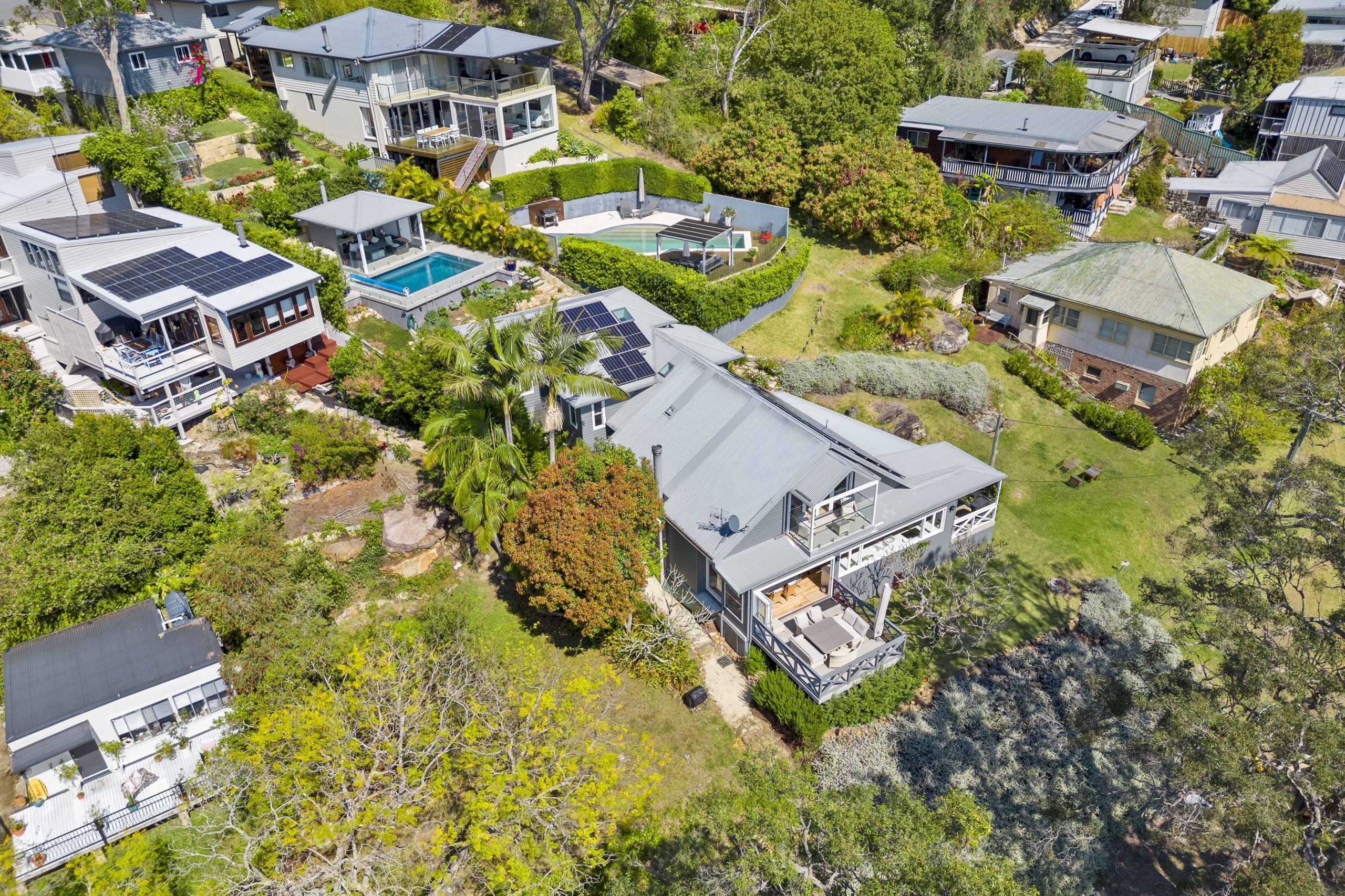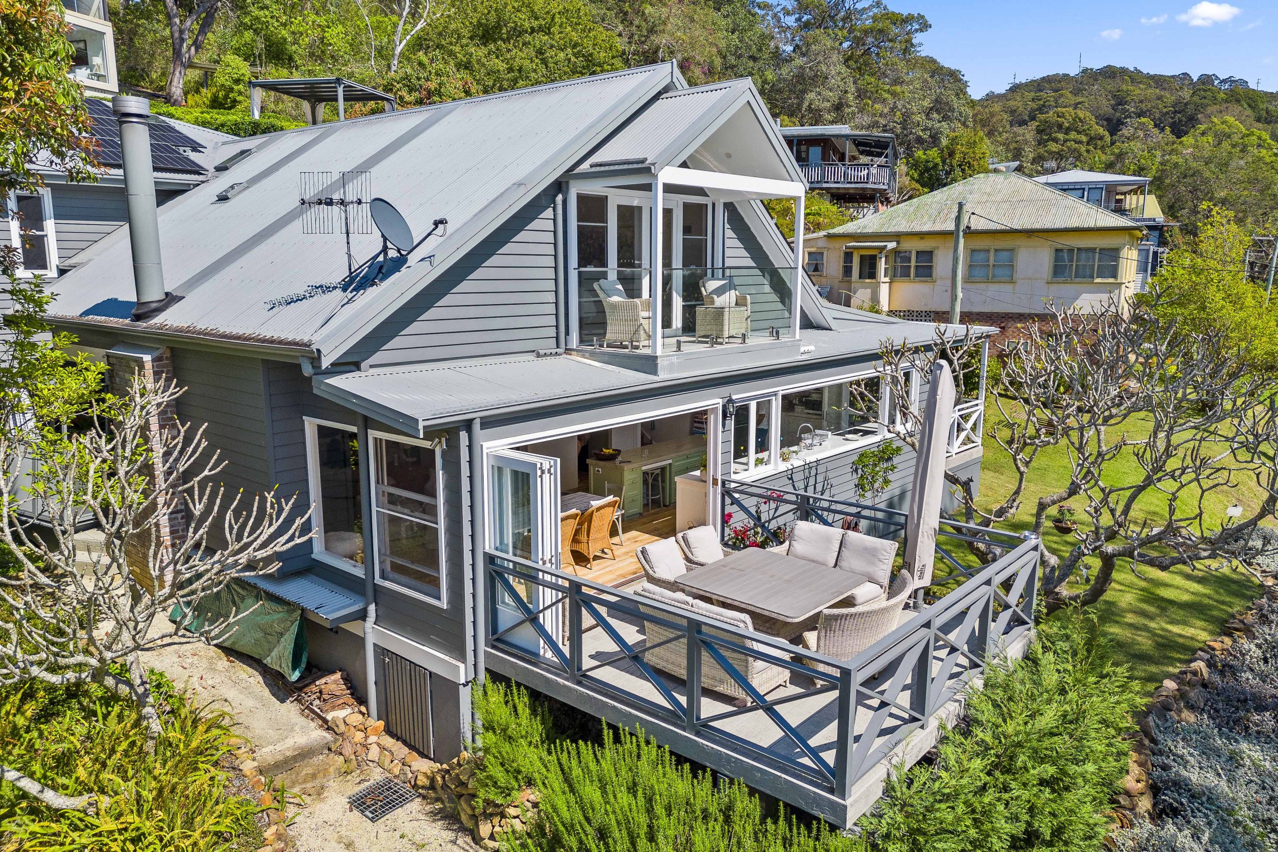 Rustic Touch’s expertise in alterations and additions is evident in the structural components seamlessly integrated into the home. The bathroom, adorned with an exposed rock wall, serves as a testament to the marriage of natural elements and contemporary design. While the heart of this residence is its open-planned kitchen, where the seamless 6m window frames a captivating panorama of Brisbane Water and the surrounding bushland.