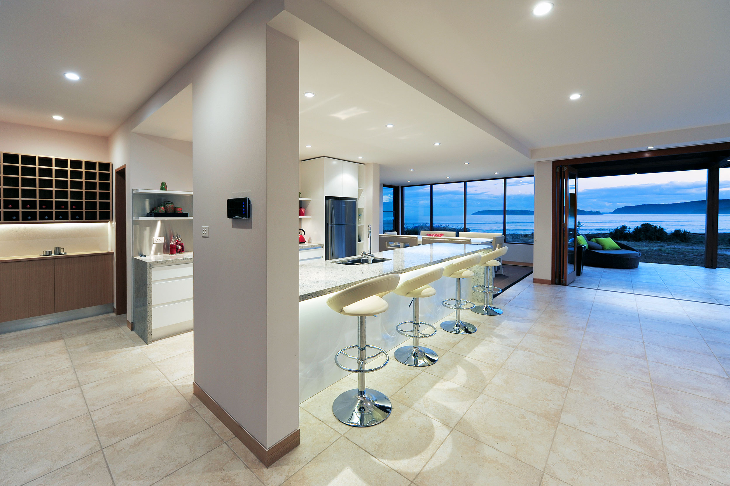 Lan Yue ge meaning ‘Water front home that sees moon light first’. The design is simple, with the shape and layout drawing you through to the water view. Two sets of bi-fold doors lead you from the open plan Lounge through to the southern tiled patio. The open pergola has LED down lights recessed in to Recycled Hardwood beams creating a stunning evening ambiance.