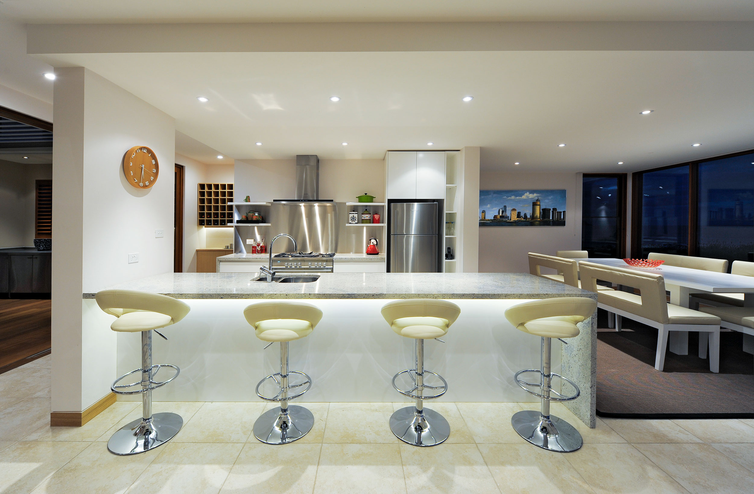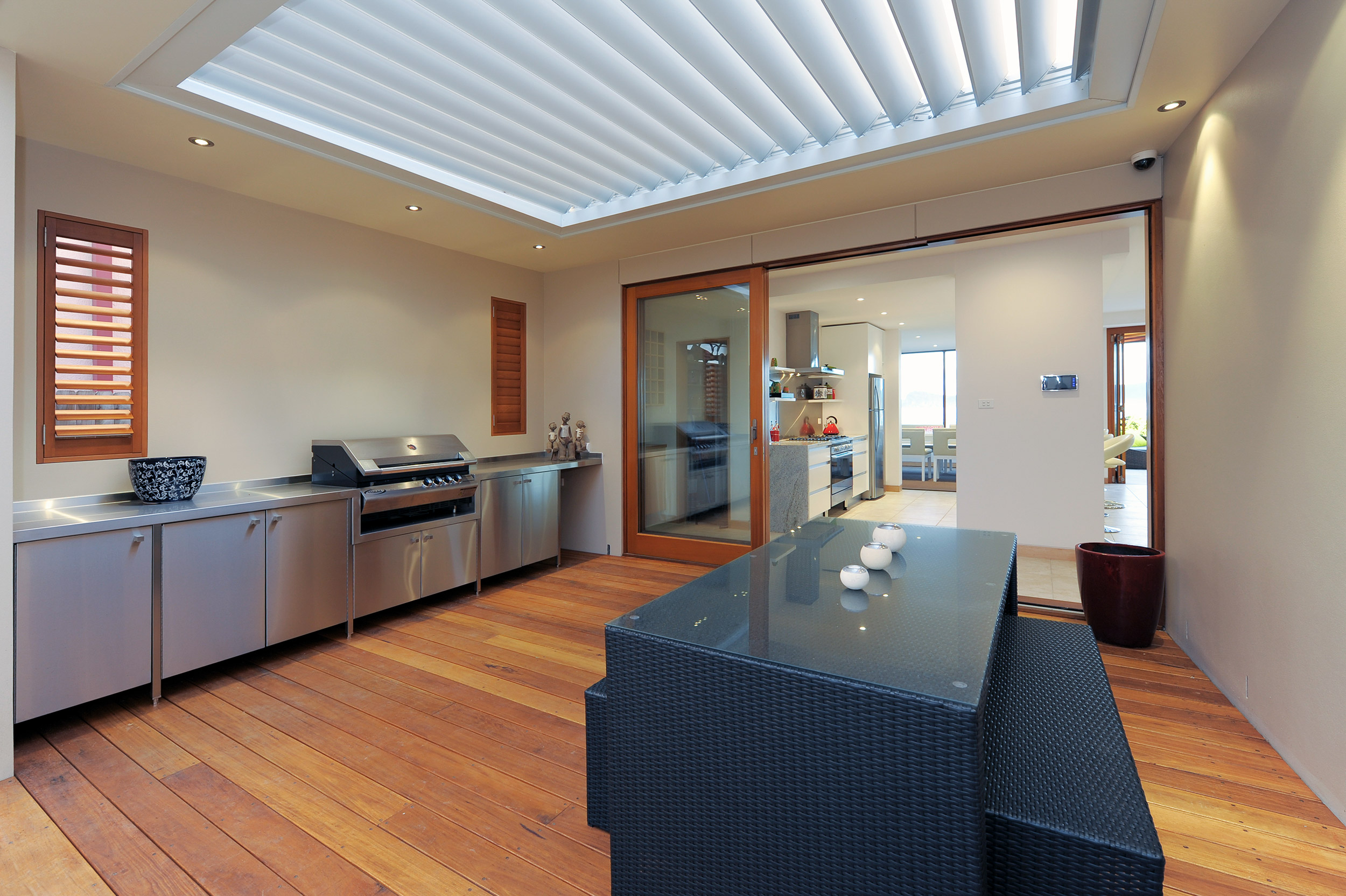 On the northern side of the open plan Kitchen is a hardwood timber deck covered by a ‘Vergola’ with a bulkhead surround housing LED down lights.