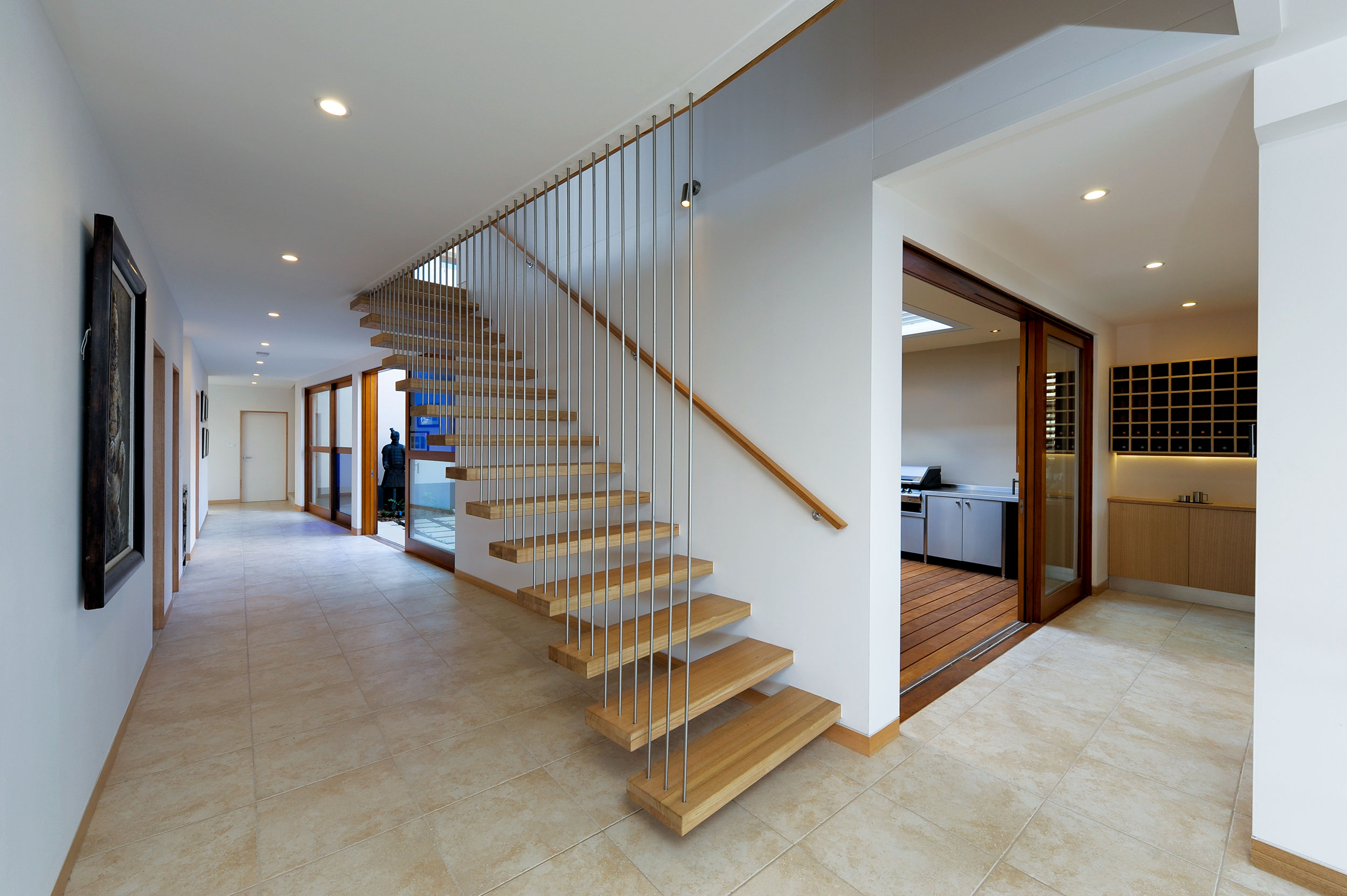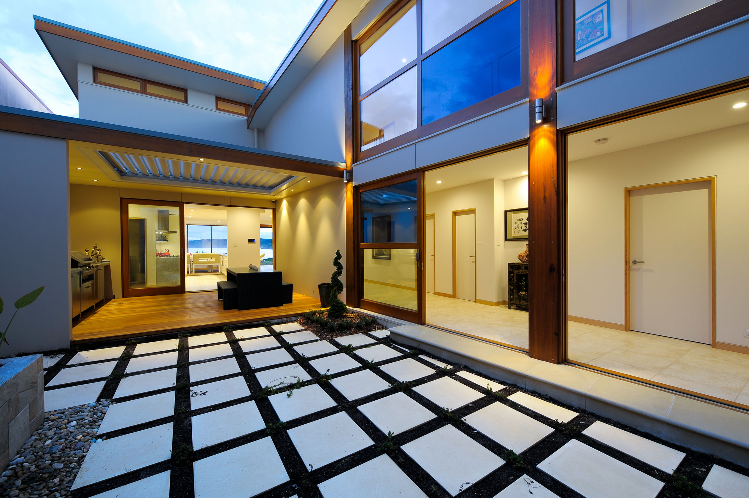 The court yard is designed with the use of Chinese philosophy using, plants, stone, water and architecture to create the ambience of peace and warmth, though used in a more contemporary manor. The focus is still drawn to the view through large stacker glass doors leading into the hallway and kitchen, giving the ability to invite the outside in.