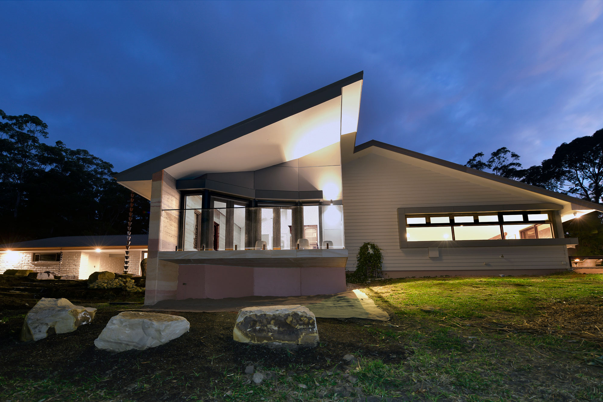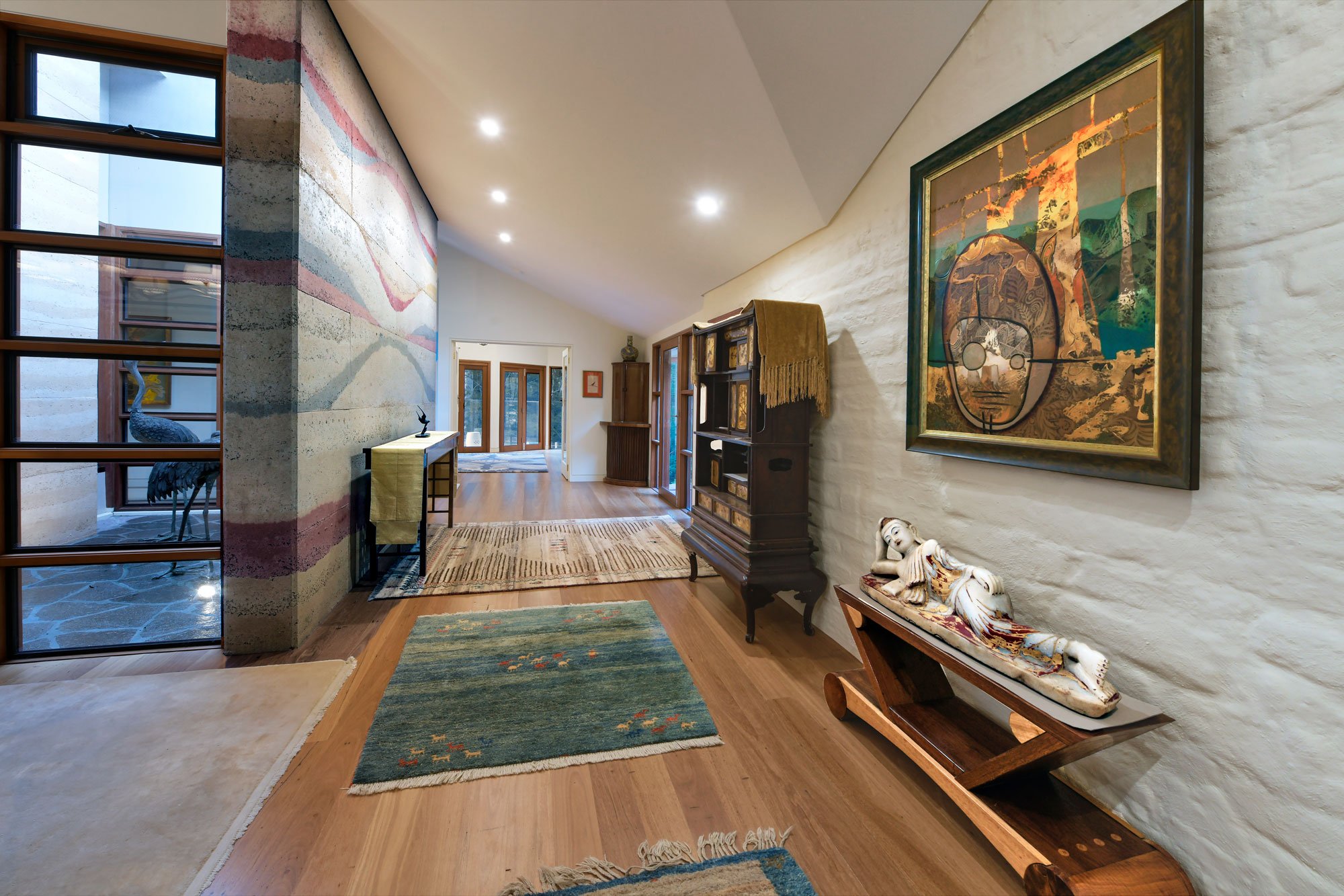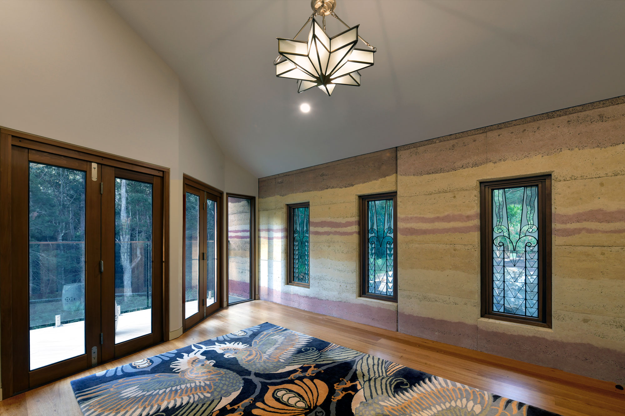 Rammed earth was used externally at the entry of the home, connecting to and complementing the earthiness of the existing mud-brick home, then again to the internal atrium with one wall creating the entry feature with the opposite wall housing the Jet master fireplace and chimney which protrudes from the roof gaining thermal mass to the centre of the home.