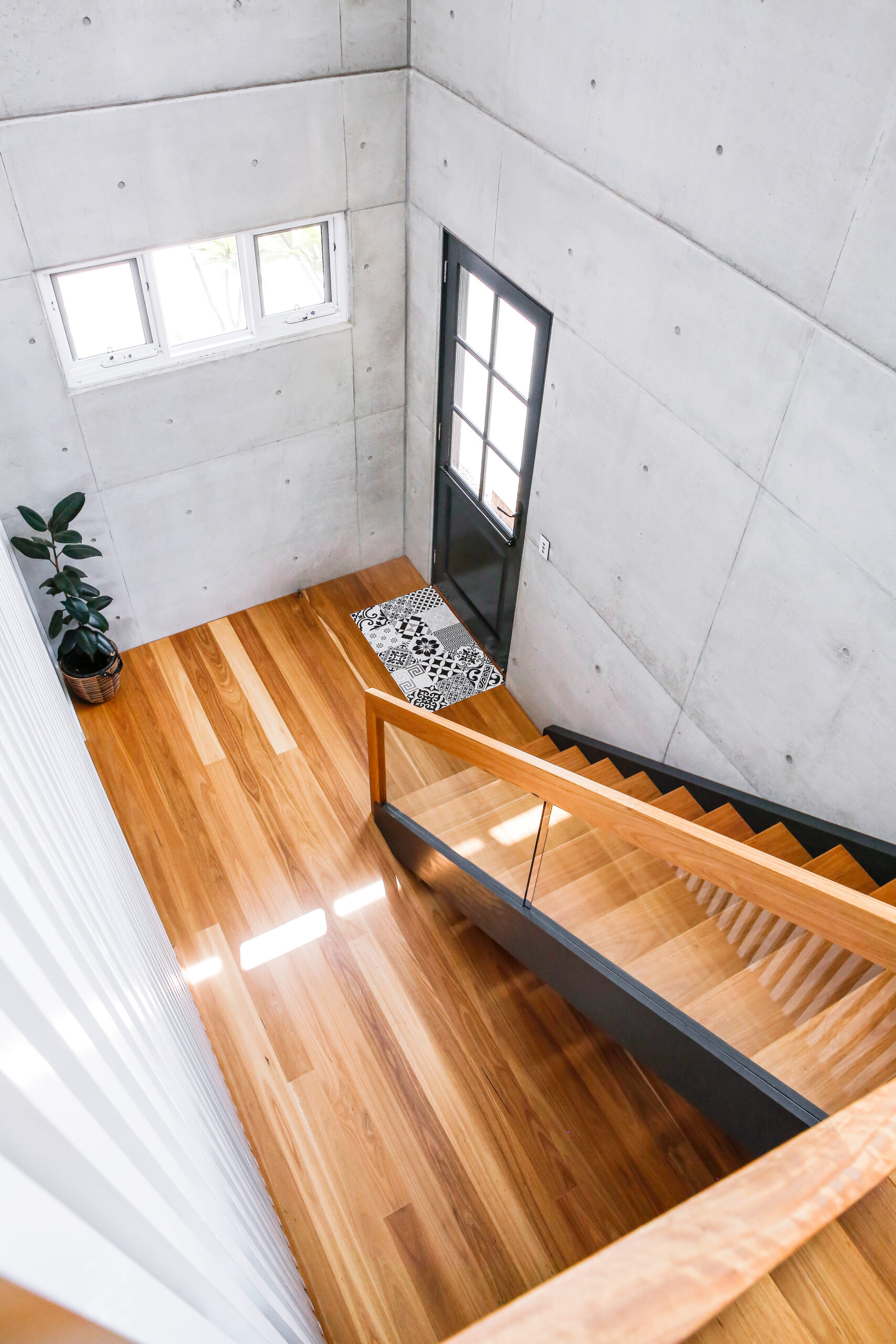 Creating a new off-form concrete entry also housed the new staircase connecting to the 1st-floor addition.